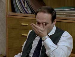 Tak? No to doskonale. (Kładzie rękę na jej udo.) Zresztą wie pani, mniejsza o starców, tu mieszkają także i dzieci. Ja... mógłbym pomóc uniknąć, mógłbym ukryć prawdę, ale na początek mogła by mi pani... (Zabiera się do całowania, co kończy się podobnie jak w przypadku Furmana - "liść" pierwsza klasa.)